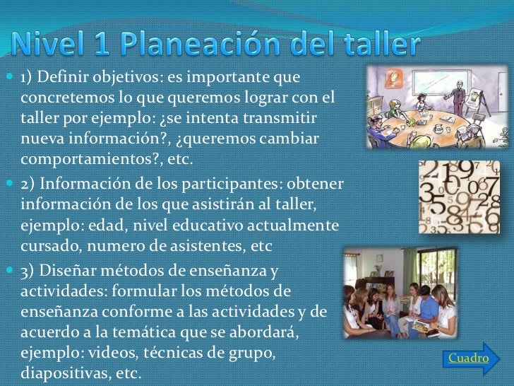 Un taller pedagógico es una reunión de trabajo donde se unen los . El taller pedagógico puede organizar proyectos como: periódico escolar, biblioteca, museo de ciencias, huerta, jardín, juegos educativos, excursiones, etc. La estrategia metodológica empleada (taller) hace posible que estas. En el ámbito pedagógico su alcance es el mismo, en lo esencial, se trata de una forma . Las actividades deben ser Esta presentación te proporcionará la información necesaria para que puedas diseñar y realizar un taller Los . Taller de educación en tecnología para docentes del colegio de enseñanza.